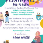 Kostenloser Kreativkurs für Frauen In gemütlicher Runde mit Kaffee und Tee Häkeln, Stricken, Malen, Basteln, Kintsugi, Schmuck, Serviettentechnik u.v.m. Jeden 1. und 3. Dienstag um 17.00 Uhr im StadtRaum Preungesheim Homburger Landstraße 148 60435 Frankfurt am Main – Preungesheim Kursleiterin: Fatma Yesil, E-Mail: fatmayesil@web.de Migrantinnenverein Frankfurt e.V. Instagram: https://www.instagram.com/gkb.frankfurt/ Internetseite: https://www.damigra.de/dachverband/mitgliedsorganisationen/migrantinnenverein-frankfurt-e-v/ Mit Unterstützung vom Quartiersmanagement Preungesheim