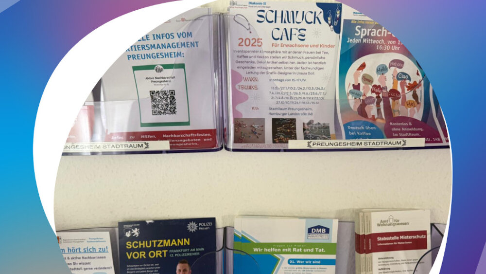 Wir, die Stadtteilflüsterinnen sind bereits seit 2 Jahren in Preungesheim unterwegs und verteilen Informationen rund um unseren Stadtteil an die Bewohner/innen. Zukünftig wird es im StadtRaum einen Infopoint mit regelmäßiger Sprechstunde geben. Den Infopoint wollen wir gemeinsam mit Ihnen am Donnerstag, 23. Oktober 2025 eröffnen. Sie sind herzlich eingeladen von 14.00 bis 16.00 Uhr im StadtRaum Preungesheim vorbeizukommen!