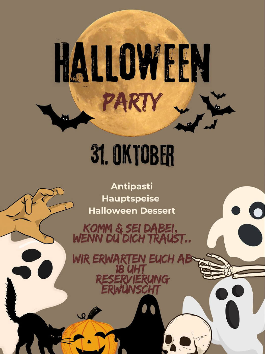 Die Pizzeria Salvatore lädt euch zum Halloween-Event ein: Mit Antipasti, Hauptspeise und Halloween-Dessert erwarten wir euch um 18.00 Uhr im Restaurant.